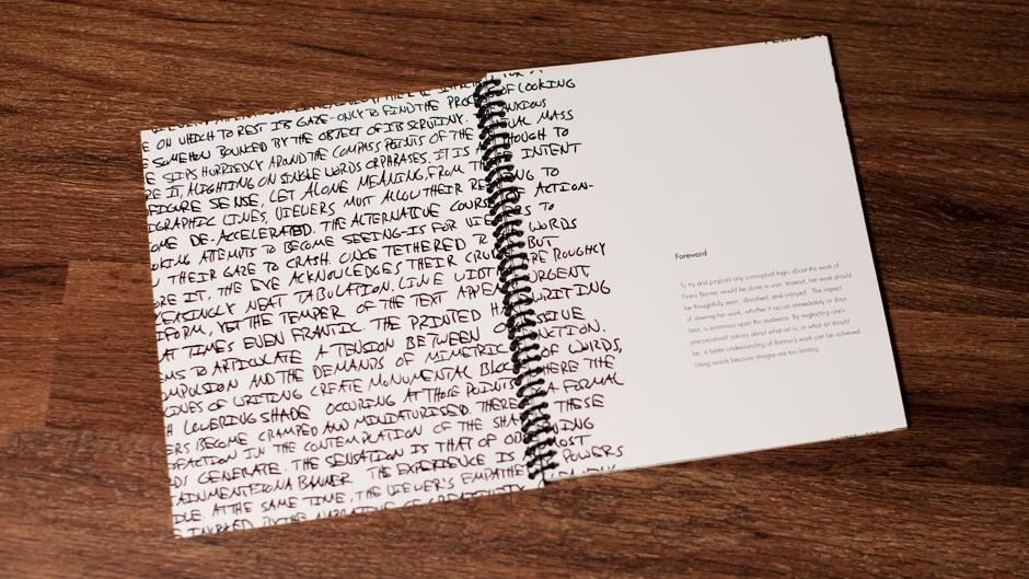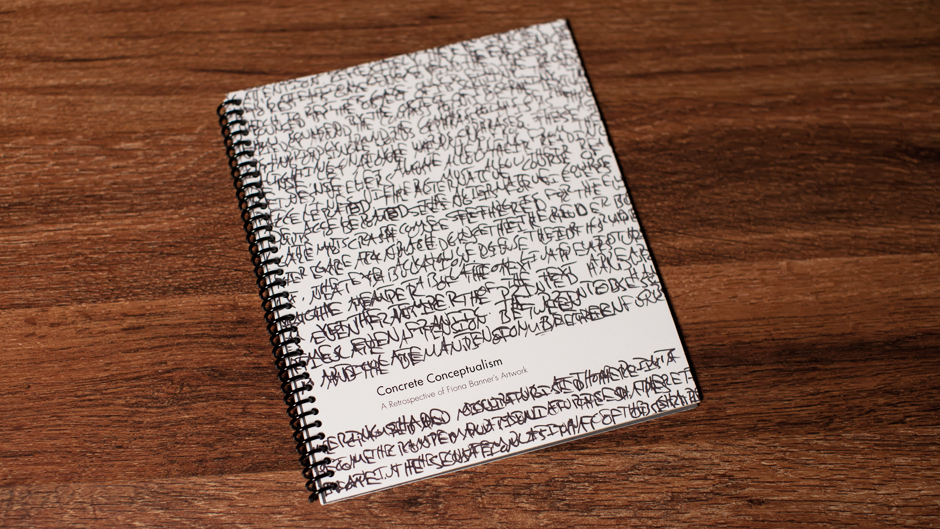 Poster and catalog about a modern conceptual fine artist. The poster draws from Fiona Banner’s “word-scapes,” in which she describes what she sees by writing it out by hand. All decorative type throughout the poster and catalog is hand rendered.