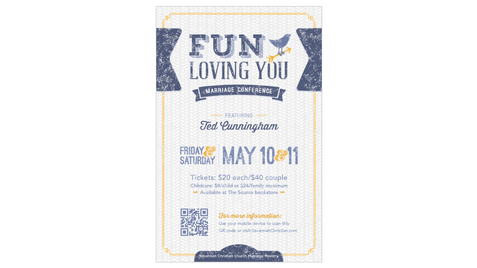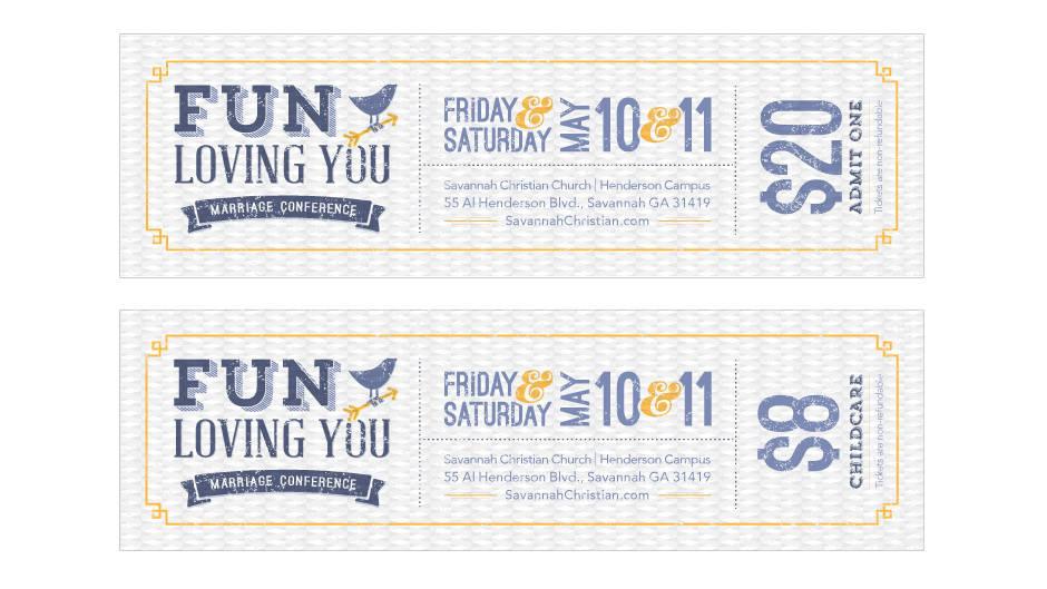 Flyer, general admission and childcare tickets for a marriage conference at Savannah Christian Church.