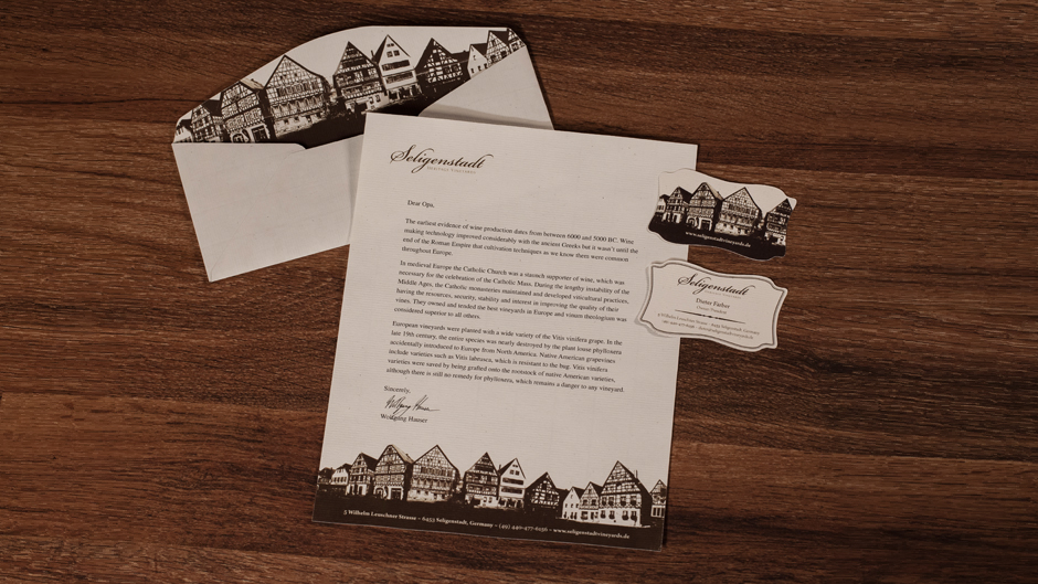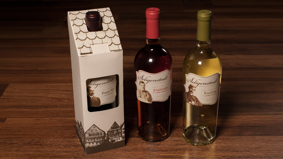 The design challenge was to use a person for inspiration and conceptualization of a company. My father was born and raised in Seligenstadt, Germany, and throughout my childhood he often took me there to visit. The design was based on the fachwerkhaus architectural styles of the homes, the wine that my father enjoys and the ornate details of the iron work in the small town.